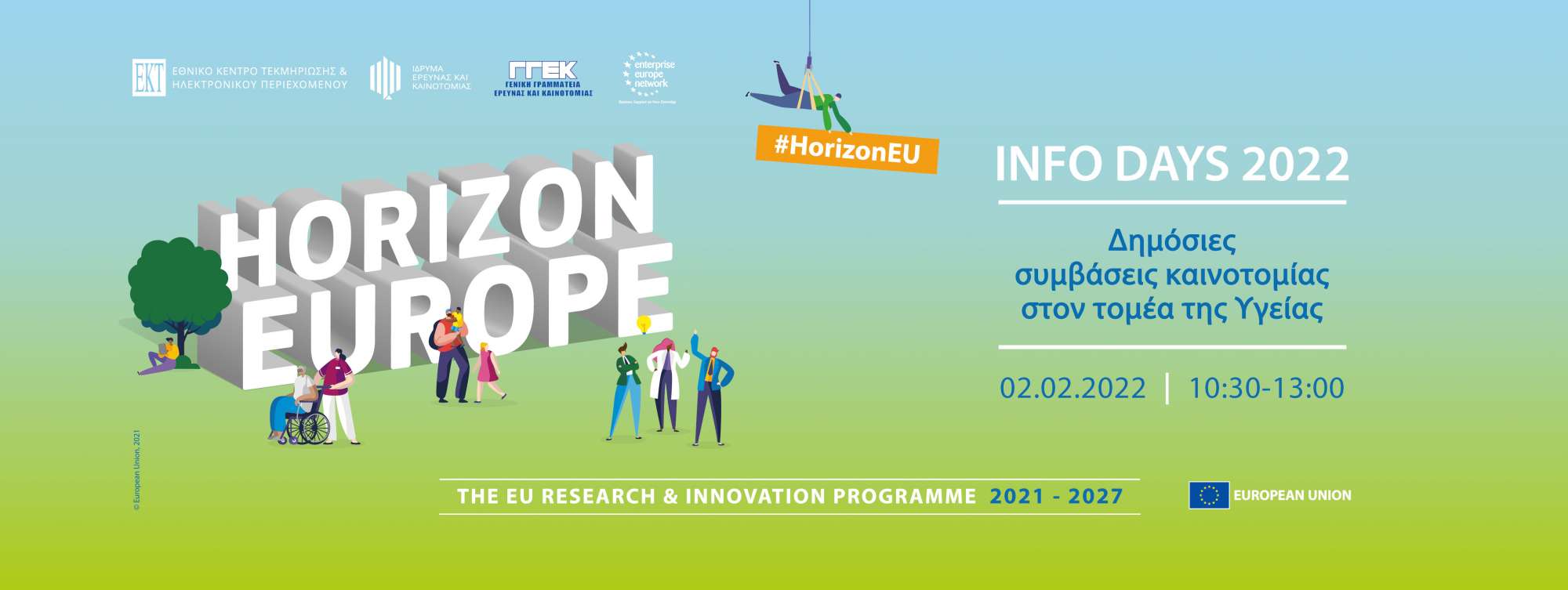 Το Ίδρυμα Έρευνας και Καινοτομίας (ΙδΕΚ) και το Εθνικό Κέντρο Τεκμηρίωσης και Ηλεκτρονικού Περιεχομένου (ΕΚΤ), Εθνικά Σημεία Επαφής για τον Ορίζοντα Ευρώπη, σας προσκαλούν στη διαδικτυακή εκδήλωση που διοργανώνουν με θέμα «Ορίζοντας Ευρώπη: Δημόσιες συμβάσεις καινοτομίας στον τομέα της Υγείας», την Τετάρτη 2 Φεβρουαρίου 2022 (10:30-13:00) διαδικτυακά, μέσω Zoom. H εκδήλωση διοργανώνεται σε συνεργασία με τη Γενική Γραμματεία Έρευνας και Καινοτομίας (ΓΓΕΚ) και την Ευρωπαϊκή Επιτροπή (DG CONNECT) και εστιάζει στις δράσεις Pre-Commercial Procurement (PCP) & Public Procurement of Innovative Solutions (PPI) που υποστηρίζουν την ανάπτυξη προϊόντων και τεχνολογικών λύσεων δημοσίου συμφέροντος και τη μεταφορά καινοτόμων λύσεων στην αγορά, καθώς και στις χρηματοδοτικές ευκαιρίες που προσφέρονται μέσω των συγκεκριμένων δράσεων στον Ορίζοντα Ευρώπη.