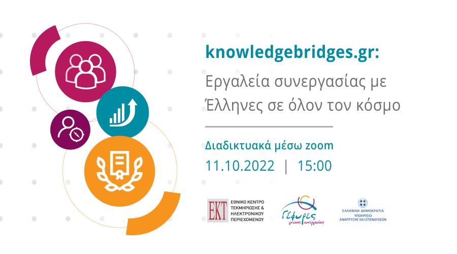 Το Ίδρυμα Έρευνας και Καινοτομίας στο πλαίσιο της συνεργασίας του με το Εθνικό Κέντρο Τεκμηρίωσης και Ηλεκτρονικού Περιεχομένου (ΕΚΤ) της Ελλάδας, ενημερώνει τους/τις ενδιαφερόμενους/ες για τη διοργάνωση διαδικτυακού σεμιναρίου παρουσίασης των υπηρεσιών που παρέχονται από την Ψηφιακή Πλατφόρμα της Πρωτοβουλίας «Γέφυρες Γνώσης και Συνεργασίας» www.knowledgebridges.gr, την Τρίτη 11 Οκτωβρίου 2022 στις 15:00.