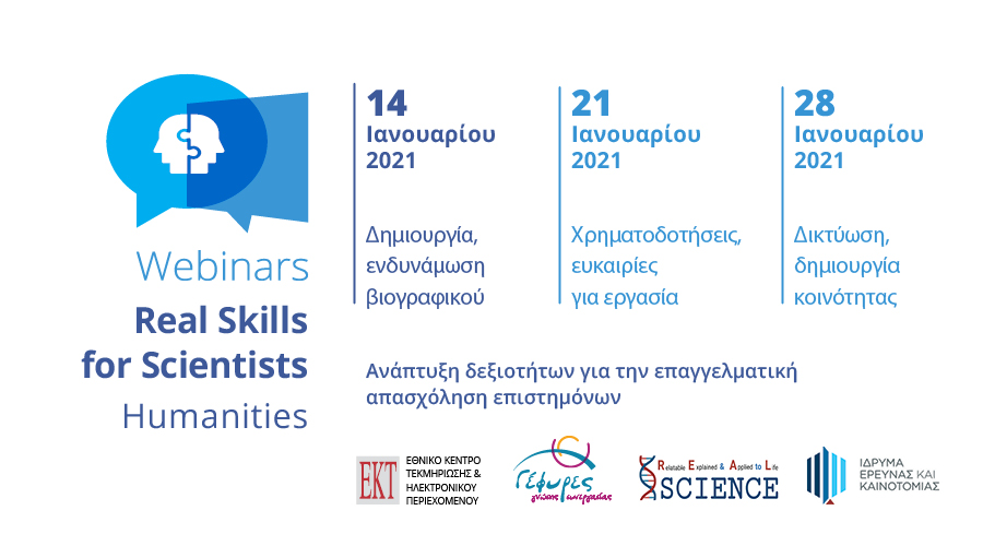 Το 1ο webinar θα λάβει χώρα την Πέμπτη 14 Ιανουαρίου (17:30-19:00). Στο πλαίσιο του webinar θα παρουσιαστούν οι πρωτοβουλίες Γέφυρες Γνώσης και Συνεργασίας, R.E.A.L. Science και το Ίδρυμα Έρευνας και Καινοτομίας Κύπρου. Στη συνέχεια τον λόγο θα πάρουν δύο ερευνήτριες, ένας ερευνητής και μία επιχειρηματίας, οι οποίοι ζουν και εργάζονται στην Ελλάδα, την Κύπρο και τις ΗΠΑ, και θα μιλήσουν για τη δημιουργία βιογραφικού σημειώματος, τις προϋποθέσεις που πρέπει να πληρούνται για τη διαμόρφωση της επαγγελματικής σταδιοδρομίας και την επίτευξη των στόχων που θέτουμε κατά την καριέρα μας.