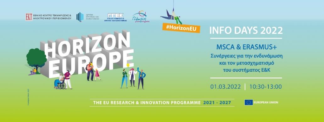 Το  Ίδρυμα Έρευνας και Καινοτομίας (ΙδΕΚ) και το Εθνικό Κέντρο Τεκμηρίωσης και Ηλεκτρονικού Περιεχομένου (ΕΚΤ) της Ελλάδος, Εθνικά Σημεία Επαφής για τον Ορίζοντα Ευρώπη, σας προσκαλούν στην διαδικτυακή εκδήλωση που διοργανώνουν με θέμα «Οι Δράσεις Marie Skłodowska-Curie & το Πρόγραμμα Erasmus+: συνέργειες για την ενδυνάμωση και μετασχηματισμό του συστήματος Ε&Κ»,  την Τρίτη 1η Μαρτίου 2022, στις 10:30-13:00, διαδικτυακά, μέσω Zoom. H εκδήλωση, η οποία θα εστιάσει στην στρατηγική συνεργασία μεταξύ των Δράσεων Marie SkłodowskaCurie (MSC) και του προγράμματος  Erasmus+, διοργανώνεται σε συνεργασία με τη Γενική Γραμματεία Έρευνας και Καινοτομίας (ΓΓΕΚ) της Ελλάδας και την Ευρωπαϊκή Επιτροπή (Γενική Διεύθυνση Νεολαίας, Αθλητισμού και Πολιτισμού (DG EAC).
