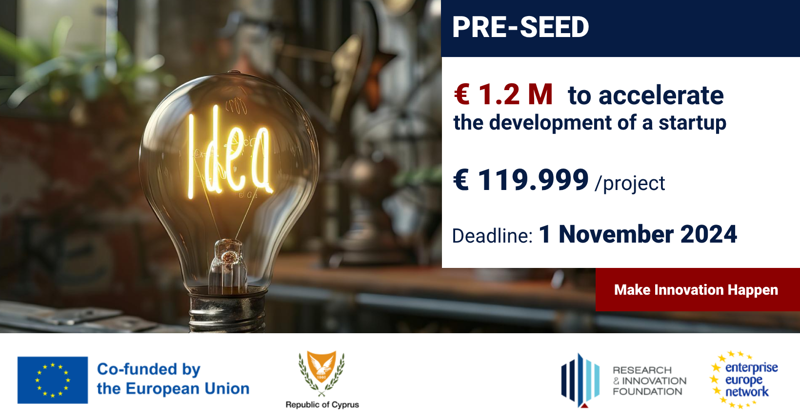 Στο πλαίσιο της προσπάθειας για ενίσχυση της νεοφυούς και καινοτόμου επιχειρηματικότητας της Κύπρου, το Ίδρυμα Έρευνας και Καινοτομίας (ΙδΕΚ) ανακοινώνει τη νέα πρόσκληση του προγράμματος PRE-SEED, με συνολικό προϋπολογισμό €1,2 εκατ.