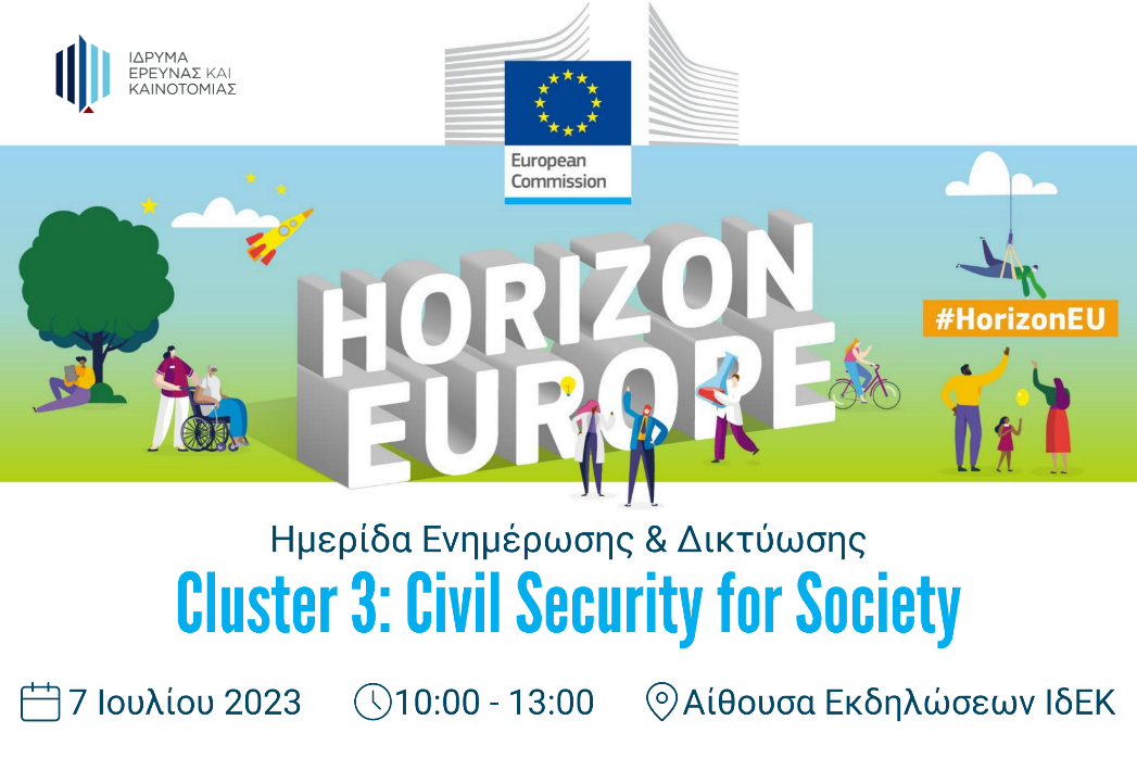 Το Ίδρυμα Έρευνας και Καινοτομίας (ΙδΕΚ) σας προσκαλεί στην Ημερίδα Ενημέρωσης και Δικτύωσης που διοργανώνει με θέμα το Cluster 3: Civil Security for Society (Πολυτομεακή Προτεραιότητα 3: Πολιτική Προστασία για την Κοινωνία), την Παρασκευή 7 Ιουλίου 2023, στις 10:00-13:00.
