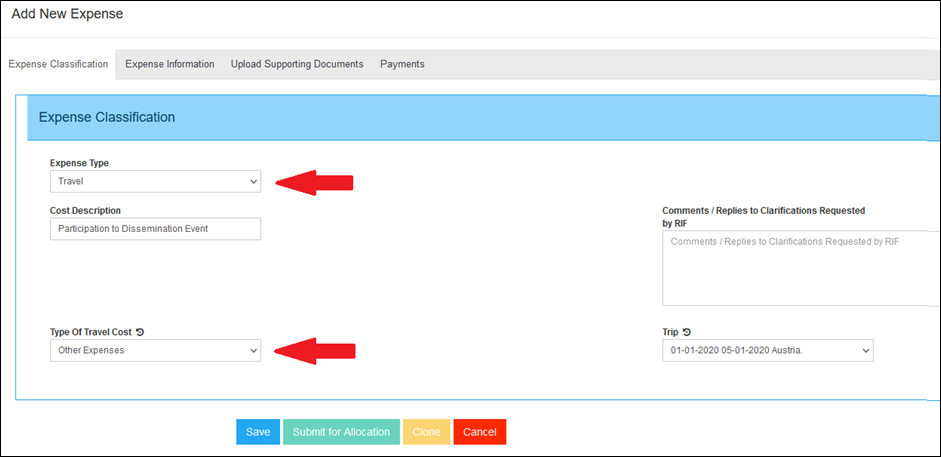 - Στην καρτέλα «Expense Classification» καταχωρείται η δαπάνη η οποία σχετίζεται με το ταξίδι (βλέπε ενότητα 2.6.2 «Add New Expense»). Να χρησιμοποιηθεί η κατηγορία δαπάνης «Travel» και η υποκατηγορία δαπάνης «Other Expenses». Δεν πρέπει να γίνει επιλογή «Subsistence» ούτε «Accommodation»