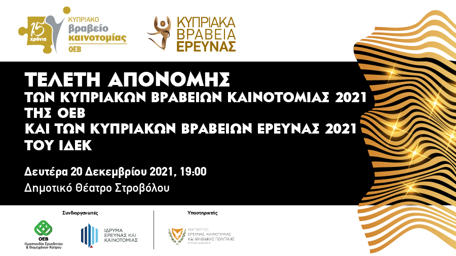 Ομοσπονδία Εργοδοτών και Βιομηχάνων (ΟΕΒ) και Ίδρυμα Έρευνας και Καινοτομίας (ΙδΕΚ) επιβραβεύουν και φέτος την έρευνα και την καινοτομία, με την τελετή απονομής των Κυπριακών Βραβείων Καινοτομίας 2021 και των Κυπριακών Βραβείων Έρευνας 2021 να πραγματοποιείται τη Δευτέρα 20 Δεκεμβρίου 2021 στο Δημοτικό Θέατρο Στροβόλου.