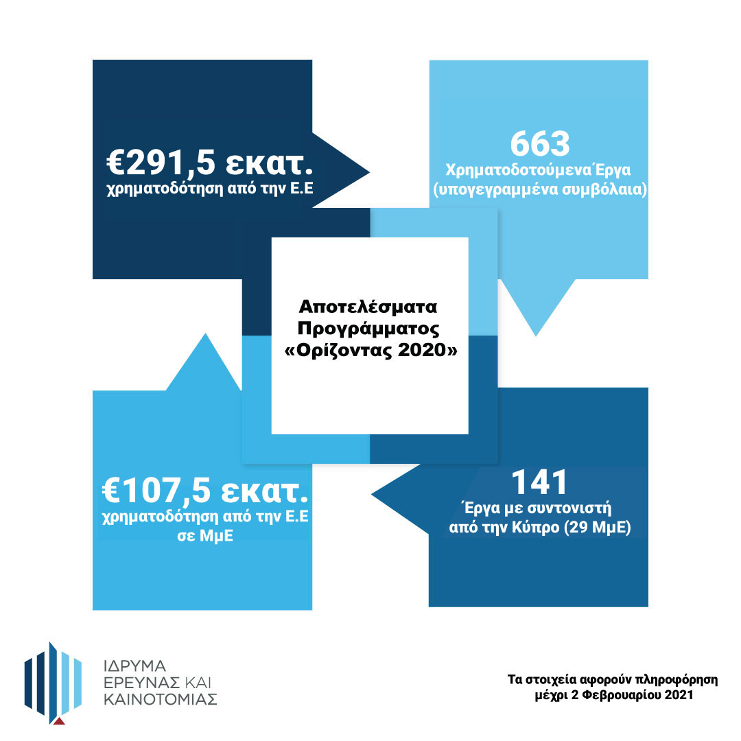Εντυπωσιακά είναι τα αποτελέσματα από τη συμμετοχή της Κύπρου στο μεγαλύτερο χρηματοδοτικό πρόγραμμα δραστηριοτήτων Έρευνας και Καινοτομίας (Ε&Κ) της Ευρωπαϊκής Ένωσης, «ΟΡΙΖΟΝΤΑΣ 2020», το οποίο ολοκληρώθηκε επίσημα τον Δεκέμβριο του 2020, με την άντληση χρηματοδότησης από κυπριακούς φορείς να ξεπερνά τα €290 εκατομμύρια.