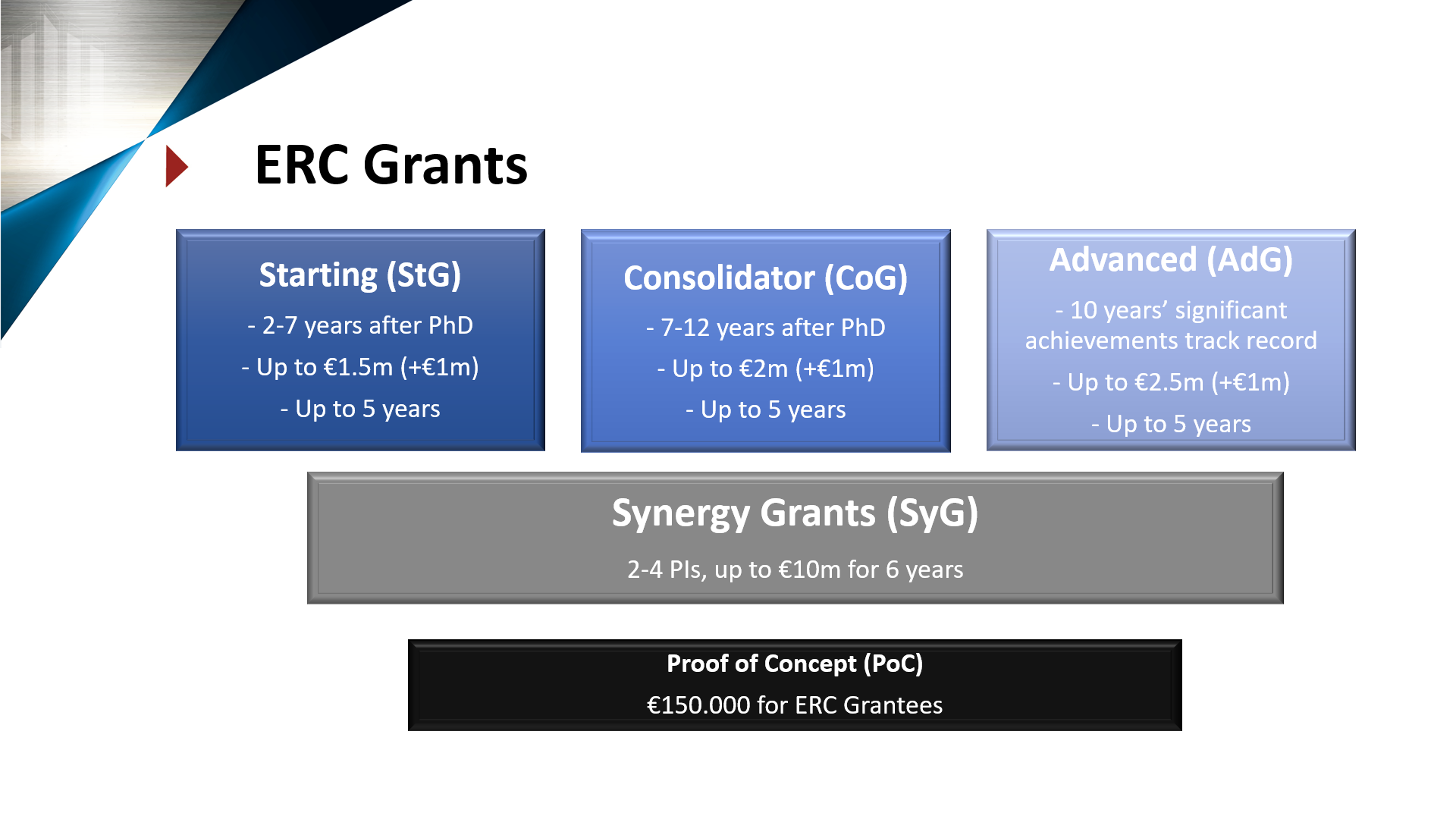 - Τα ERC Proof of Concept απευθύνονται σε επιστήμονες που ήδη υλοποιούν ή ολοκλήρωσαν πρόσφατα έργο ERC και παρέχουν 150.000 Ευρώ, προκειμένου να διερευνήσουν τη δυνατότητα μιας ιδέας που προέκυψε στο πλαίσιο του έργου αυτού να μετατραπεί σε καινοτομία, σε μια προσπάθεια να προωθηθούν άριστες ερευνητικές ιδέες προς την αγορά.