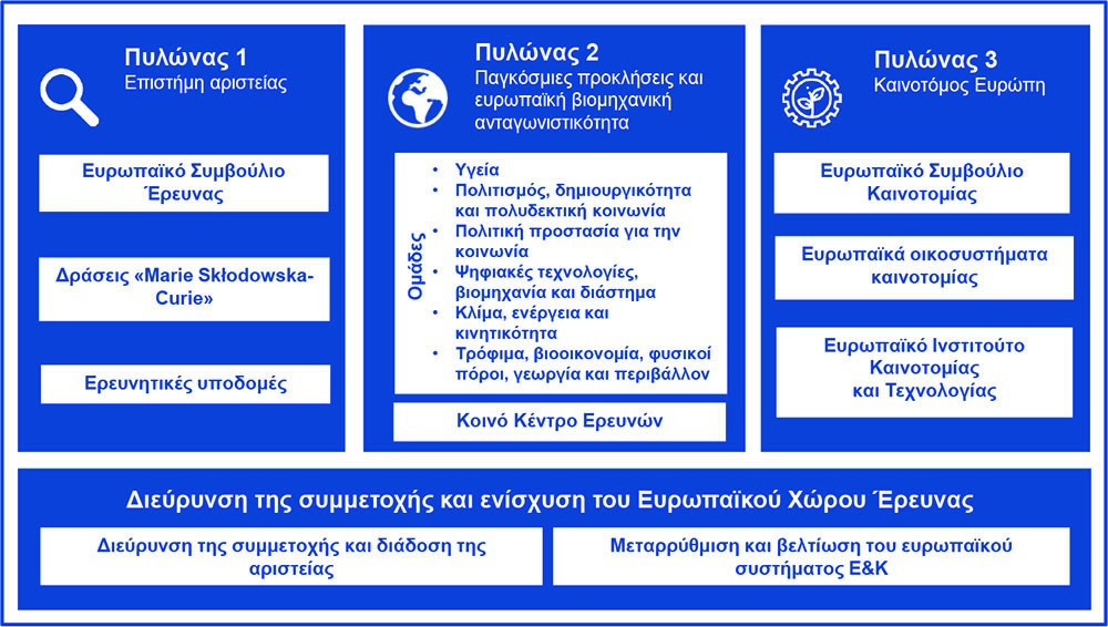 Δομή και ΠρογράμματαΤο Πρόγραμμα «Ορίζοντας Ευρώπη» περιλαμβάνει τρείς κύριους Πυλώνες: