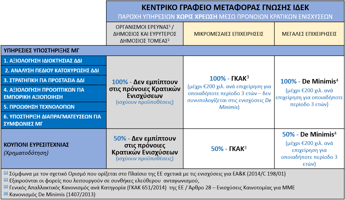 - ΑΞΙΟΛΟΓΗΣΗ ΙΔΙΟΚΤΗΣΙΑΣ ΤΩΝ ΔΔΙ: Υποστήριξη στον καθορισμό της ιδιοκτησίας των Δικαιωμάτων Διανοητικής Ιδιοκτησίας (ΔΔΙ) και των σχετικών απαιτούμενων συμφωνιών ανάμεσα στα εμπλεκόμενα μέρη.